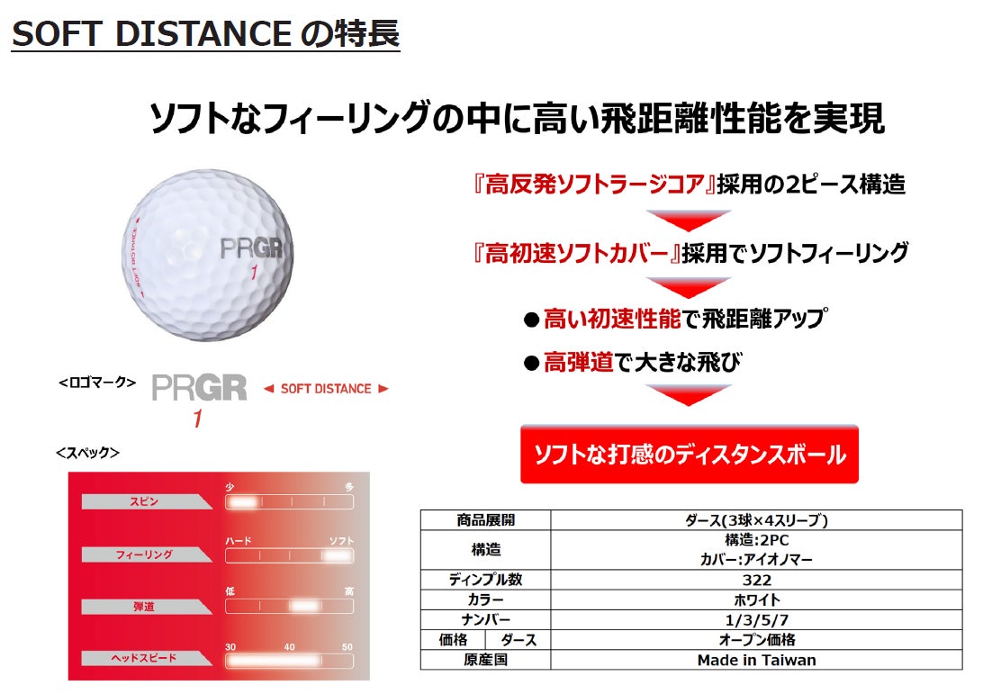 「SOFT DISTANCE」は、「高反発ソフトラージコア」と「高初速ソフトカバー」が高い初速性能と高弾道で大きな飛び、さらにソフトフィーリングを実現します。