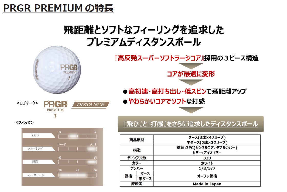「PRGR PREMIUM」は、「高反発スーパーソフトラージコア」の採用でソフトな打感を実現するとともに、コアが最適に変形することで高初速、高打ち出し、低スピン効果を生み、さらなる飛距離アップを可能にします。