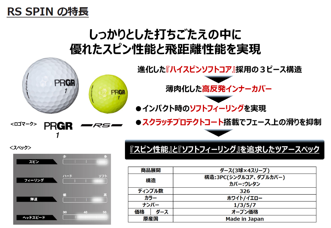 (株)プロギアは、スピン性能とソフトなフィーリングを追求したツアースペックボール「RS SPIN(アールエス・スピン)」、「飛び」と「打感」を追求したプレミアムディスタンスボール「PRGR PREMIUM(プロギア・プレミアム)」、ソフトな打感のディスタンスボール「SOFT DISTANCE(ソフト・ディスタンス)」を9月13日から発売します。スピン系1種とディスタンス系2種のラインアップで幅広いゴルファーのニーズに応えます。
