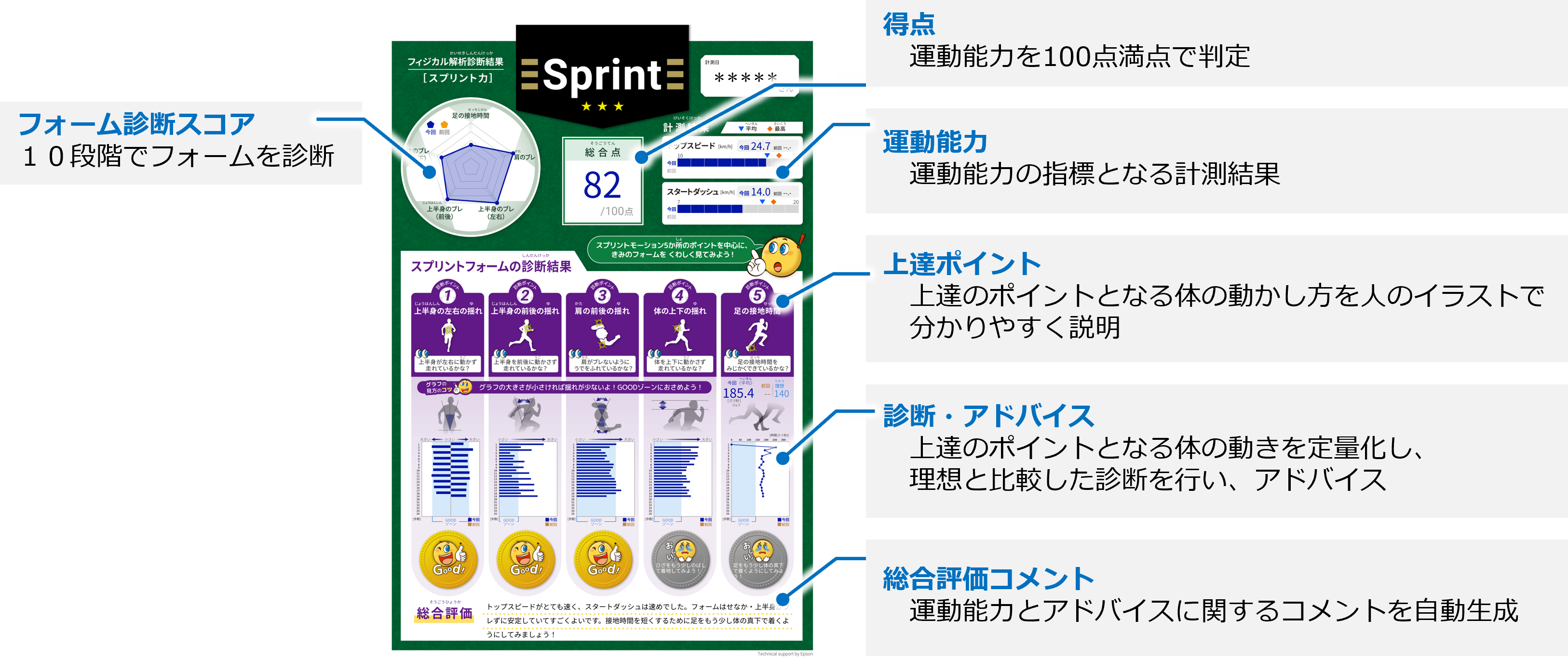 「M-Tracerテクノロジー」搭載の小型センシング端末を装着して、ダッシュ、ジャンプ、俊敏な方向転換など運動の基本動作を測定し、タイム・高さ・回数などの測定結果から、体の詳細な動きの解析を行います。一人一人の解析結果をもとに、正しい体の動かし方から、効率的にフィジカルを向上させるための診断アドバイスをレポートとして提供します。