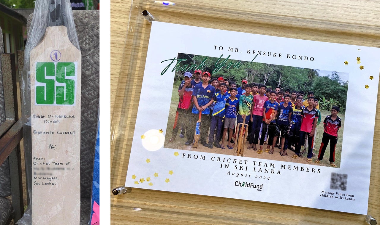 今回、成績連動型寄付に挑戦されている近藤選手に応援の気持ちを込めて、スリランカの子どもたちから、クリケットのバットをお送りしました。バットには、現地の子どもたちからの「Dear Mr. Kensuke Kondoh Ganbatte Kudasai!(近藤選手、頑張ってください!)」と温かい応援メッセージも添えられています。