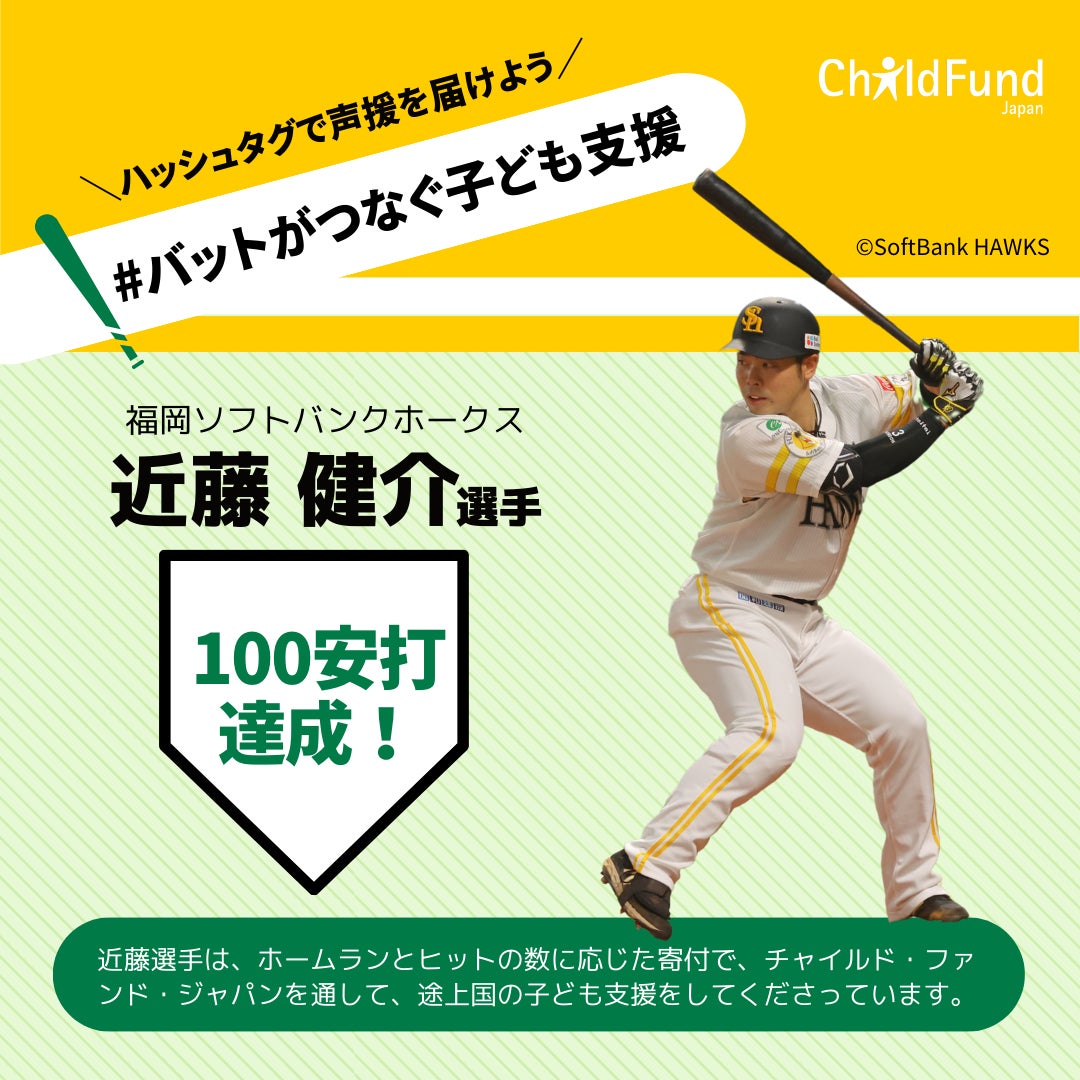 現在、セ・パ両リーグ通じて打率トップの近藤選手(2024年8月21日時点)。チャイルド・ファンド・ジャパンでは、近藤選手の一層の活躍を応援すべく、ヒット100本などの節目にあわせて、応援のSNSを投稿しています。専用のハッシュタグ「#バットでつなぐ子ども支援」をつけたリポスト、シェアを通して、ファンの皆さまといっしょに近藤選手の活躍を応援しています。