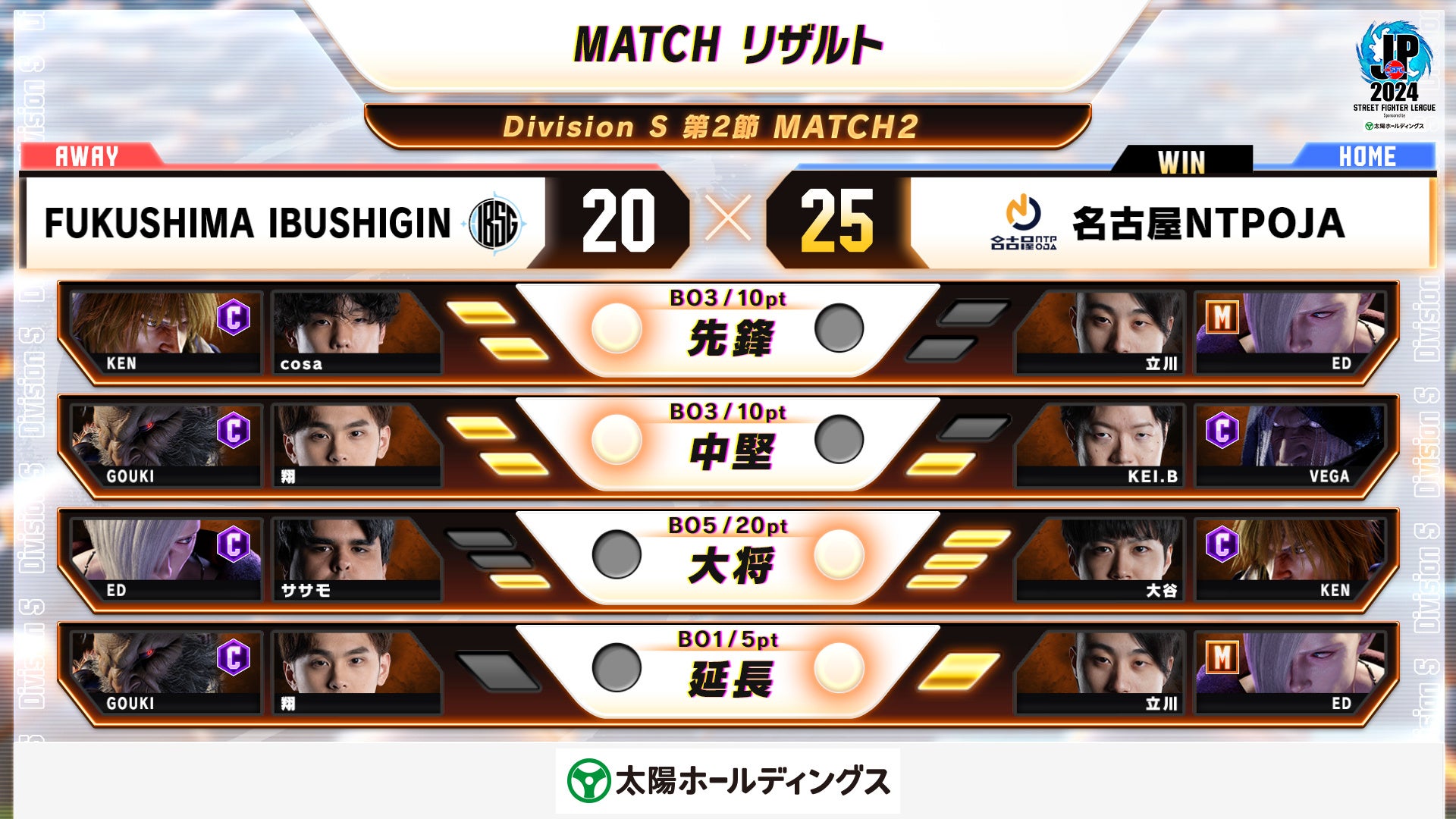前節に続き、対エド戦に出場したのは「YHC-餅選手」。ダルシムはエドに有利だと語った通り、エドの長い通常技に対し、さらに長い通常技で差し返すなど着実にリターンを得ることで瞬く間に2BATTLEを連取した。追い詰められた「ふ~ど選手」だったが、インターバルを挟むことで立て直すことに成功。ダルシムの動きに上手く対応を見せて2BATTLEを取り返した。フルセットフルラウンドの大接戦となった大将戦だったが、「ふ~ど選手」の見事な対応力が「YHC-餅選手」を上回り大逆転。チームに貴重な20ポイントを持ち帰った。