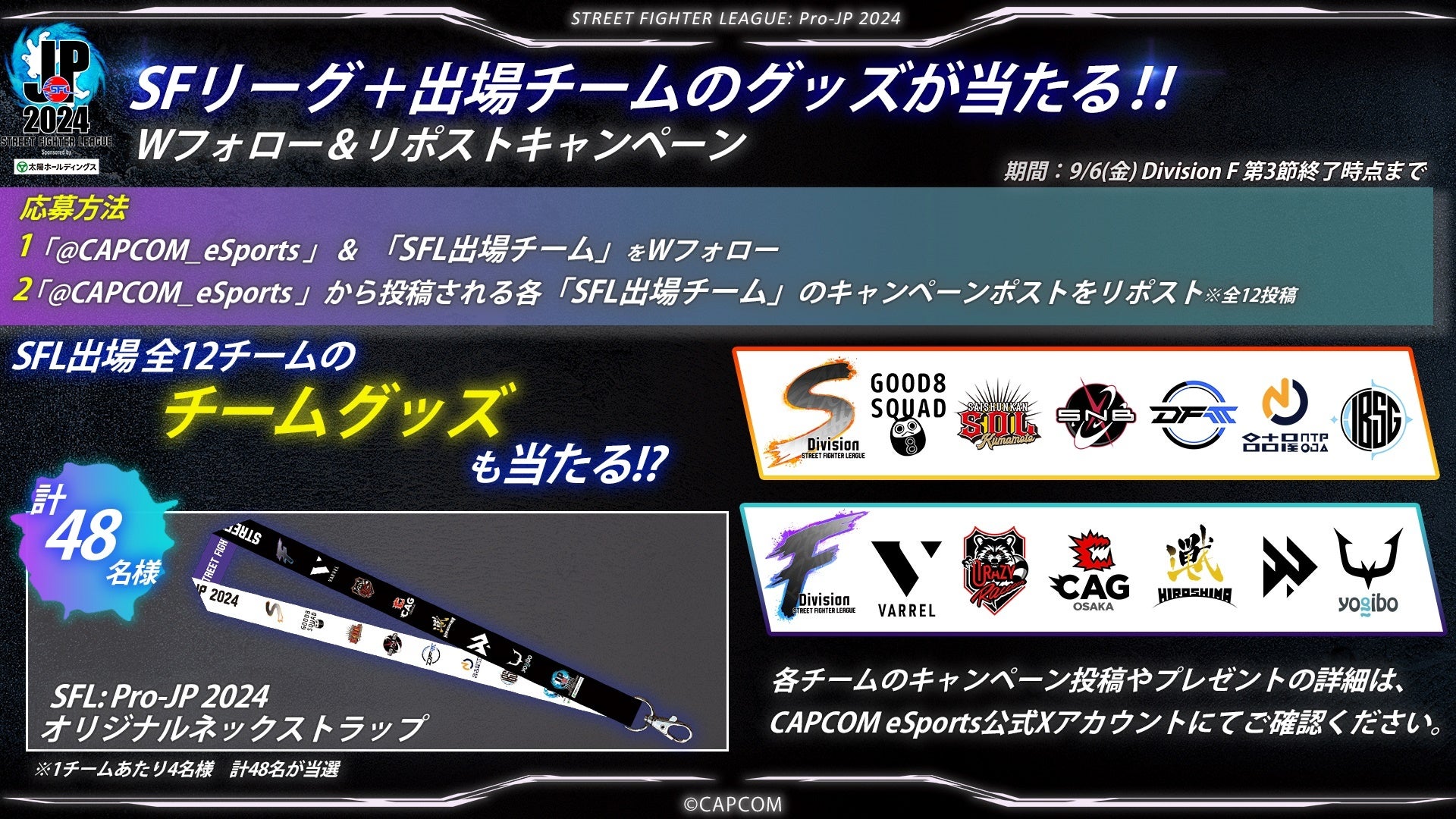 キャンペーンの詳細や各チームのグッズについては、CAPCOM eSports 公式X及び、公式HPをご確認ください。