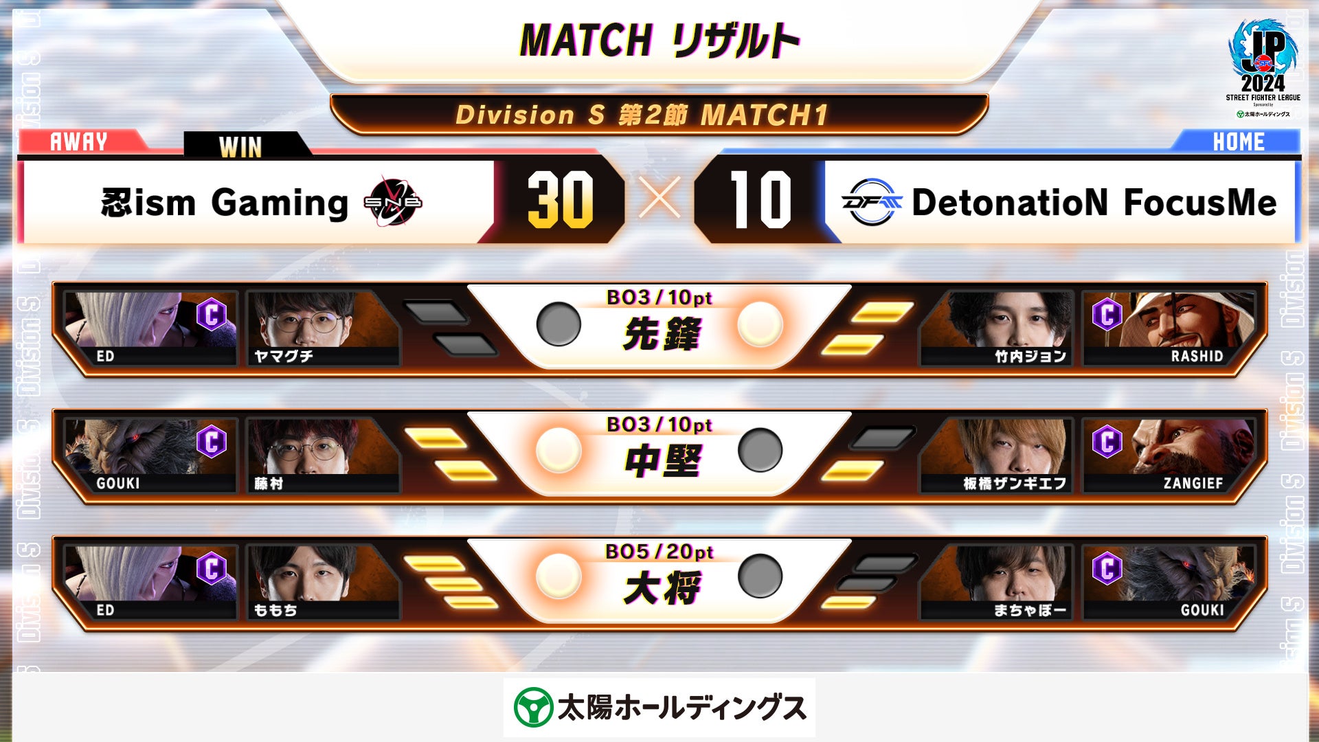 序盤から「ももち選手」の見事な間合い管理が光った大将戦。絶妙な前歩きからエドの得意とする距離で立ち回ることで「まちゃぼー選手」の豪鬼に対し有利な試合状況を作り上げた。「まちゃぼー選手」も様々な手段で反撃を試みるものの、なかなか「ももち選手」に傾いた試合の流れを取り戻すことが出来なかった。最後は「ももち選手」の代名詞スーパーアーツLv.2「サイコキャノン」からの通称「ドリームコンボ」を叩き込みフィニッシュ。頼れるリーダーが今シーズン初勝利を掴み取った。