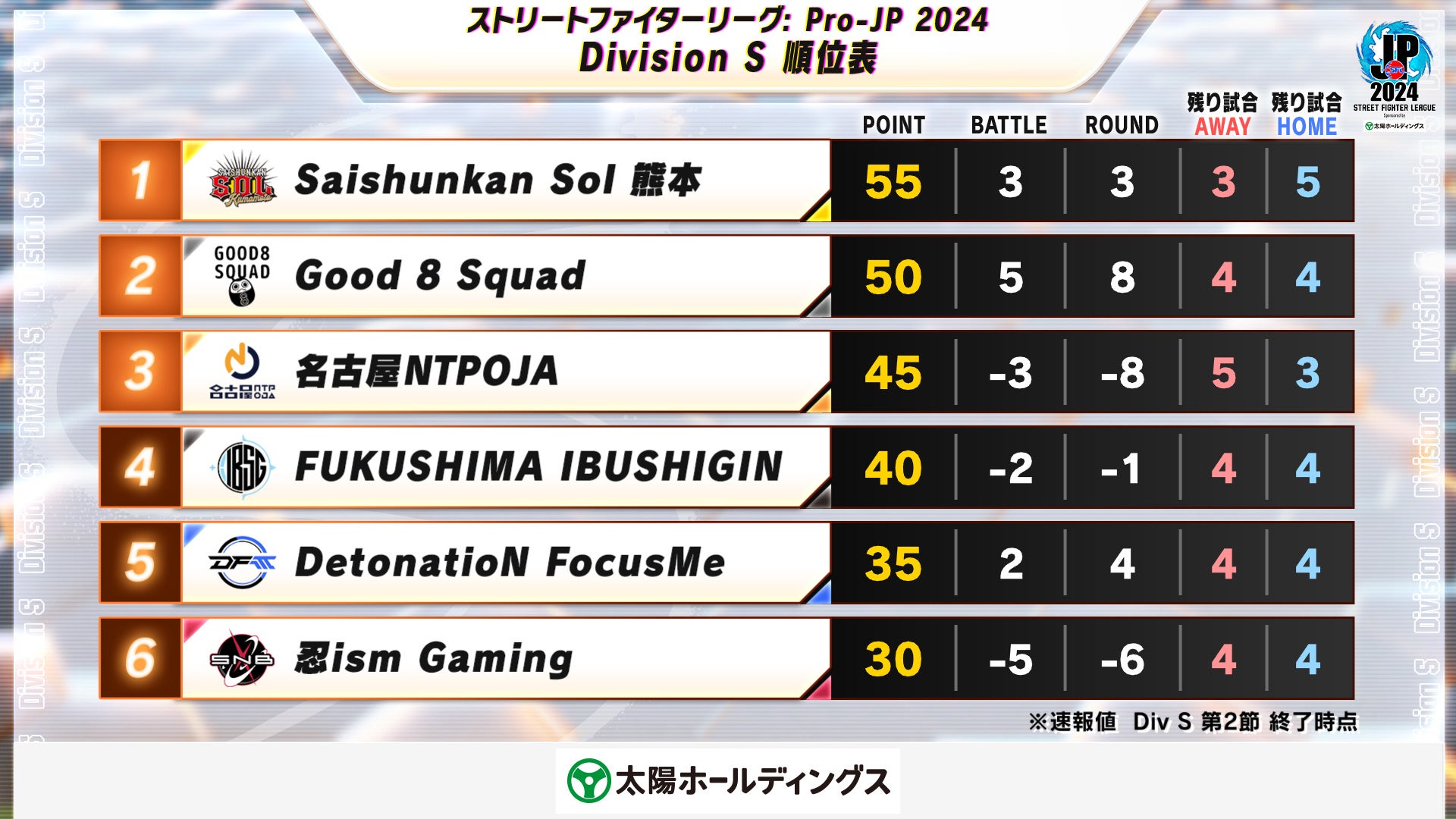 順位表(Division S 第2節 終了時点)