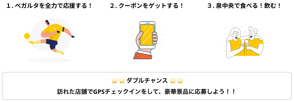 ・試合前後に利用できる泉中央駅やスタジアム周辺の飲食店や商業施設等のクーポンを提供します。