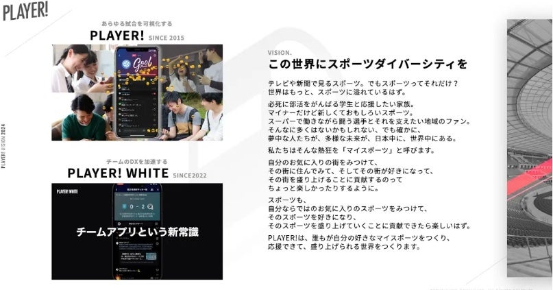 ▶︎事業内容:スポーツコミュニティアプリ「Player!」および「Player! WHITE」の開発・運営、スポーツ情報インフラの開発・運営