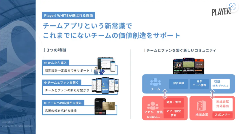 日本全国の各地域には、プロチーム以外にも、様々な競技・カテゴリーのチームが日々活動しています。プロカテゴリーを目指すチーム、独自リーグで戦うチーム、大学や高校など学生部活動。そんな「地元スポーツチーム」は、地域を巻き込み、ファンと繋がりながら、地元を盛り上げています。 しかし多くの地元スポーツチームは、プロチームほど人手や資金が充実しているとは言えません。少ないスタッフが兼務しながら多くの業務をこなしたり、資金が少ない中でやりくりしなければならず、チームを強くし勝ち続ける以上に、まずチームを存続させることに力を注がなければなりません。 私たちookamiは、「スポーツで一つの笑顔を世界に」をミッションに掲げています。地元スポーツチームの潜在価値を最大化して、本当に大事なことにもっと多くの時間を使えるようにしたいと考え、「Player! WHITE」を提案してきました。現在、200以上のチームに導入いただいており、今後さらなる拡大を目指していきます。