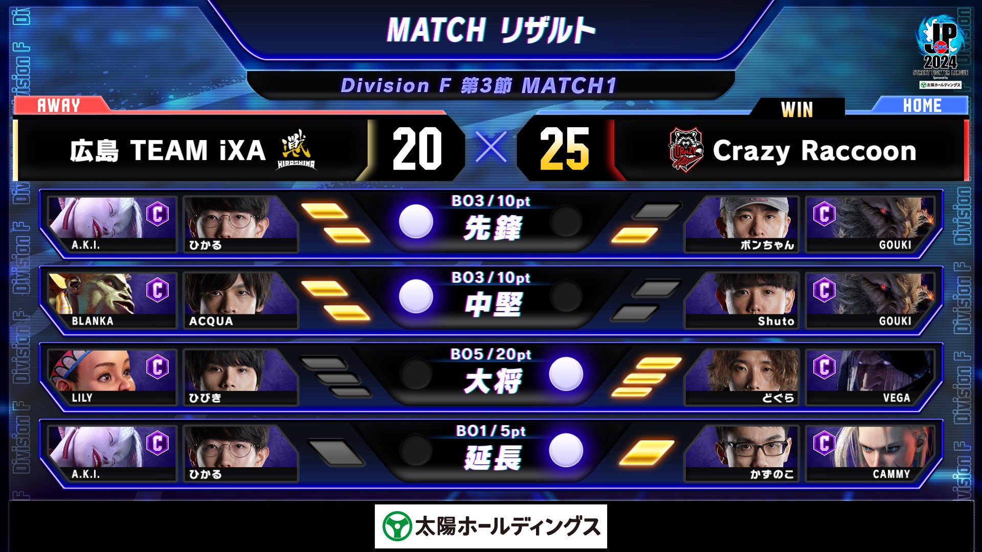 ここまでの悪い流れを切りたい「Crazy Raccoon」は、チームリーダー「どぐら選手」がベガで出場し、「ひびき選手」のリリーに挑む形となった。第1BATTLEから見事なリリー対策を披露し、試合の主導権を握る「どぐら選手」。持ち味の堅い守りと見事な立ち回りでリリーのやりたい行動を封じ続ける。そのまま、ほぼ完璧と言って良い試合内容で「どぐら選手」が3-0のストレート勝利。昨シーズン以来となる勝ち星は、チームの窮地を救う大きな一勝となった。