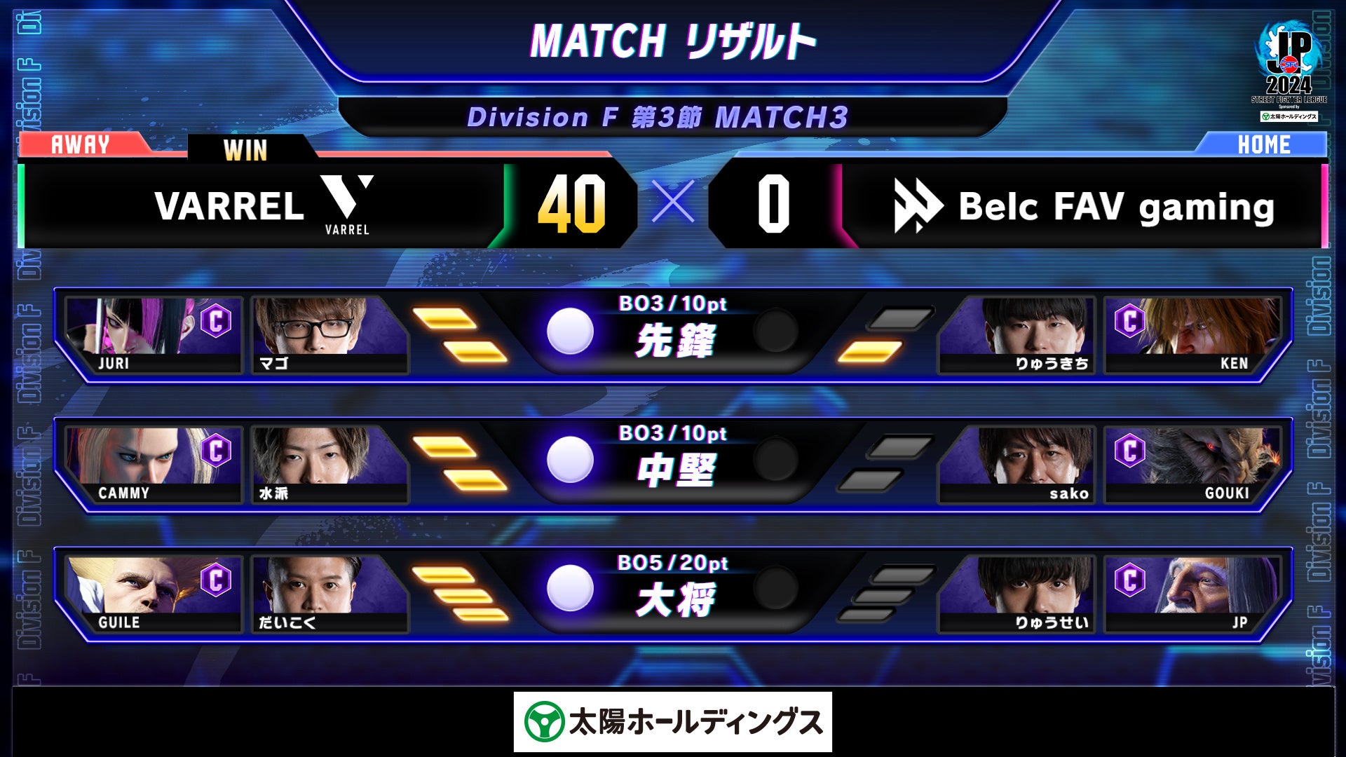 第1節の悔しさを晴らしたい「だいこく選手」のガイルに対して、「Belc FAV gaming」は「りゅうせい選手」のJPが出場する形となった。序盤から得意の遠距離攻撃で試合を組み立てようとする「りゅうせい選手」のJPに対し、積極的に距離を詰めて接近戦を仕掛ける「だいこく選手」のガイル。普段の立ち回りからは考えられないような攻めガイルの姿勢が功を奏し、「だいこく選手」が一気に試合の主導権を握った。その後も「りゅうせい選手」の反撃をものともせず、冷静に試合を進めた「だいこく選手」がストレートで大将戦に勝利。嬉しいSFリーグ初勝利を挙げた。