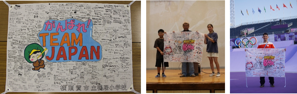 本年7月、昨年度のBMX小学校訪問実施校(全4校)の児童より、パリ五輪BMX日本代表選手団へ寄せ書き旗を贈呈しました。本事業はBMX小学校訪問を継続開催している本市ならではのものであり、児童により身近にオリンピックを感じてもらうことができました。