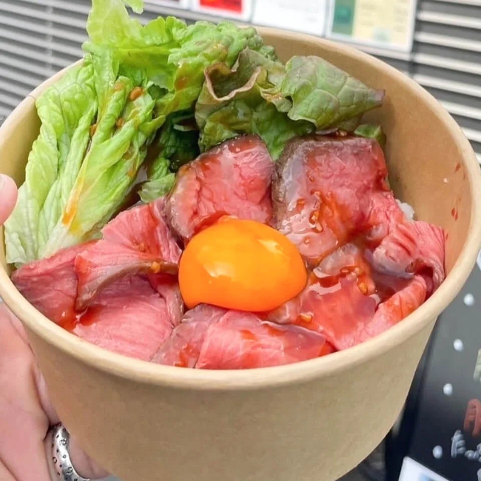ローストビーフ肉マシマシ!低音でじっくり火を通した柔らかい牛赤身肉に特性ダレを絡めてぜひお召し上がりください!肉大盛りは容器から飛び出るほどのマシマシ限界突破!