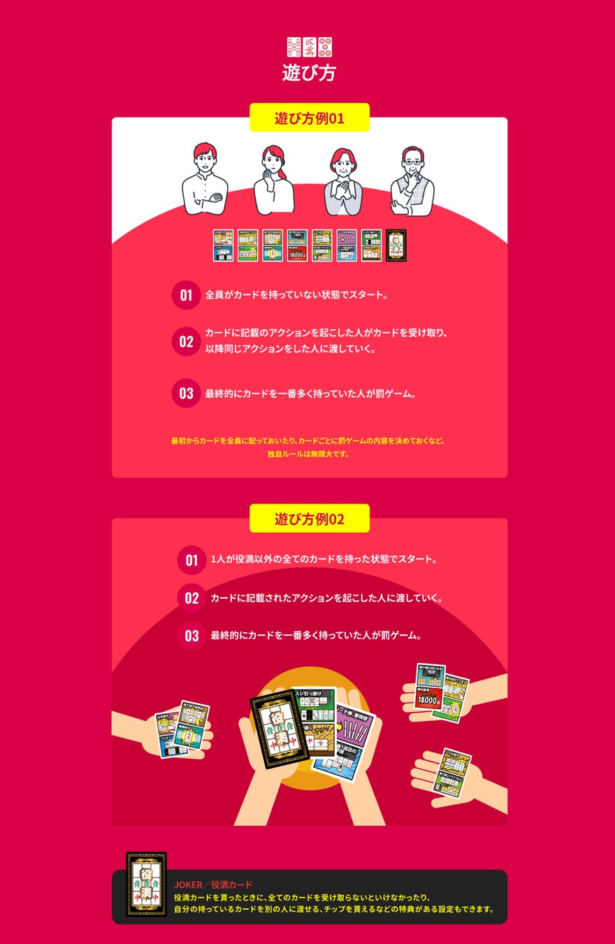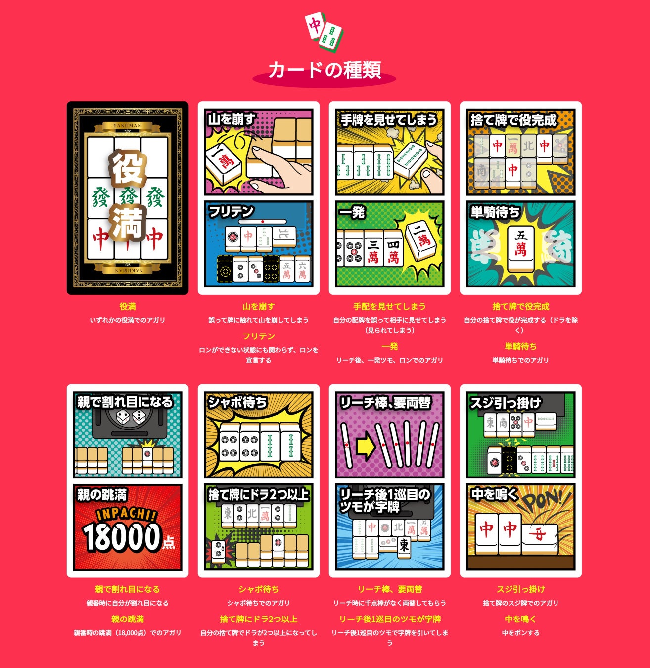 いつも通り麻雀で遊びながら、カードに描かれている内容と同じことをした人にそのカードを渡し、最終的に一番多くのカードを持っていた人がペナルティを受ける、いつもの麻雀に遊び心をプラスするカードゲームです。トランプのように、遊び方の例はあれど、使い方、ルールは自由です。好きにアレンジを加え楽しむことができます。