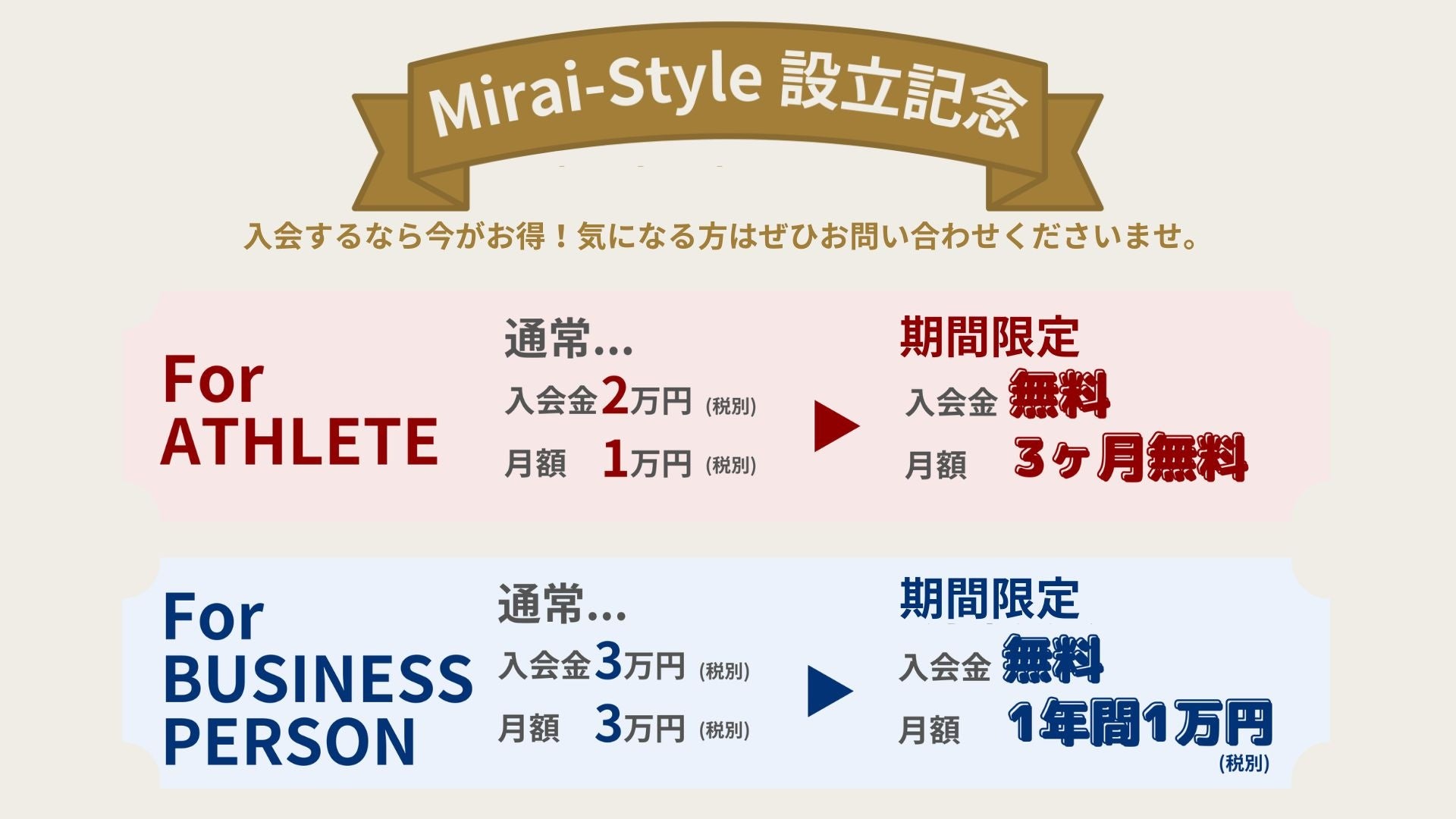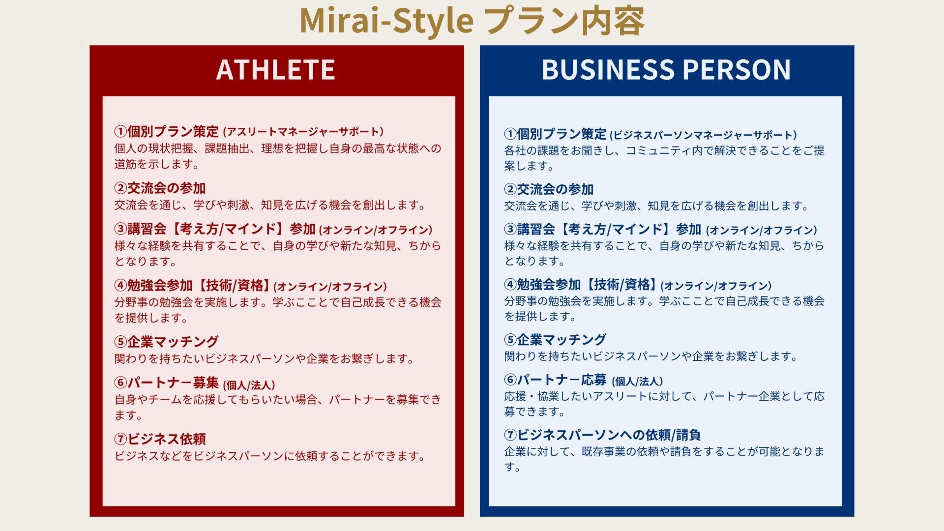 アスリートとビジネスパーソンを繋ぐ会員制コミュニティ「Mirai-Style」では、会員の方向けに交流会や講習会・勉強会、ビジネス依頼・請負などあらゆるコンテンツを提供してまいります。