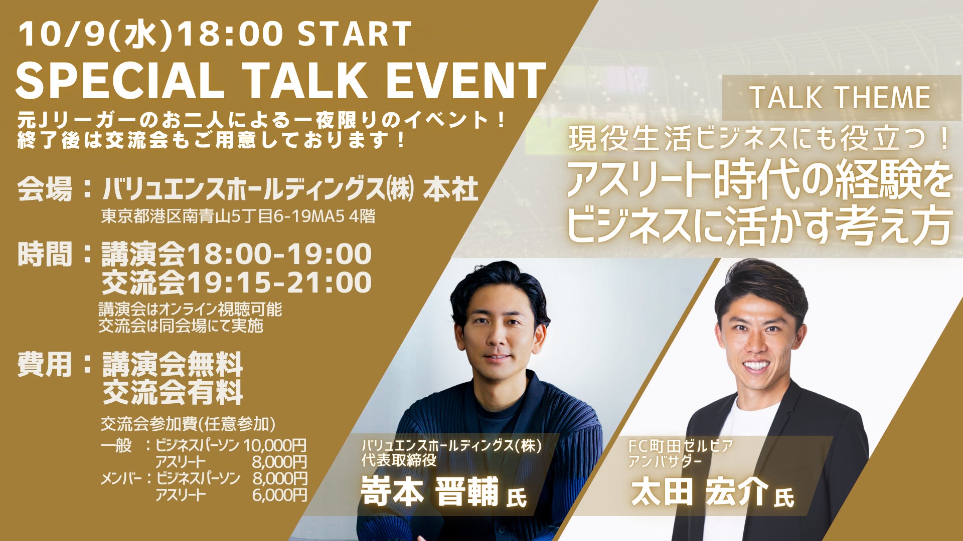 コミュニティの無料体験イベントとして【10/9(水)18:00〜@バリュエンスホールディングス株式会社 本社(南青山)】にて、嵜本晋輔氏(バリュエンスホールディングス代表取締役)×太田宏介氏(FC町田ゼルビアアンバサダー)の対談イベントを開催いたします。テーマは「現役生活、ビジネスにも役立つ!アスリート時代の経験をビジネスに活かす考え方」。元Jリーガーとしてご活躍され、引退した現在もあらゆる分野でご活躍中のお二人による一夜限りのスペシャル対談となります。ご興味がある現役アスリートやビジネスパーソンの方々のご参加をお待ちしております。