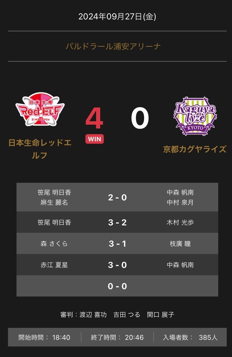 ホームプレスリリース ノジマ リーグ 2024-2025シーズン 公式戦 9月27日開催 日本生命レッドエルフvs 京都カグヤライズ 試合結果 2024年09月27日 21時20分 公開|スポーツマニア編集部プレスリリース 一般社団法人Tリーグのプレスリリース 日本生命レッドエルフと京都カグヤライズの試合は、4-0で日本生命レッドエルフが勝利しました。 詳細はこちら→https://tleague.jp/schedule/detail.php?id=764