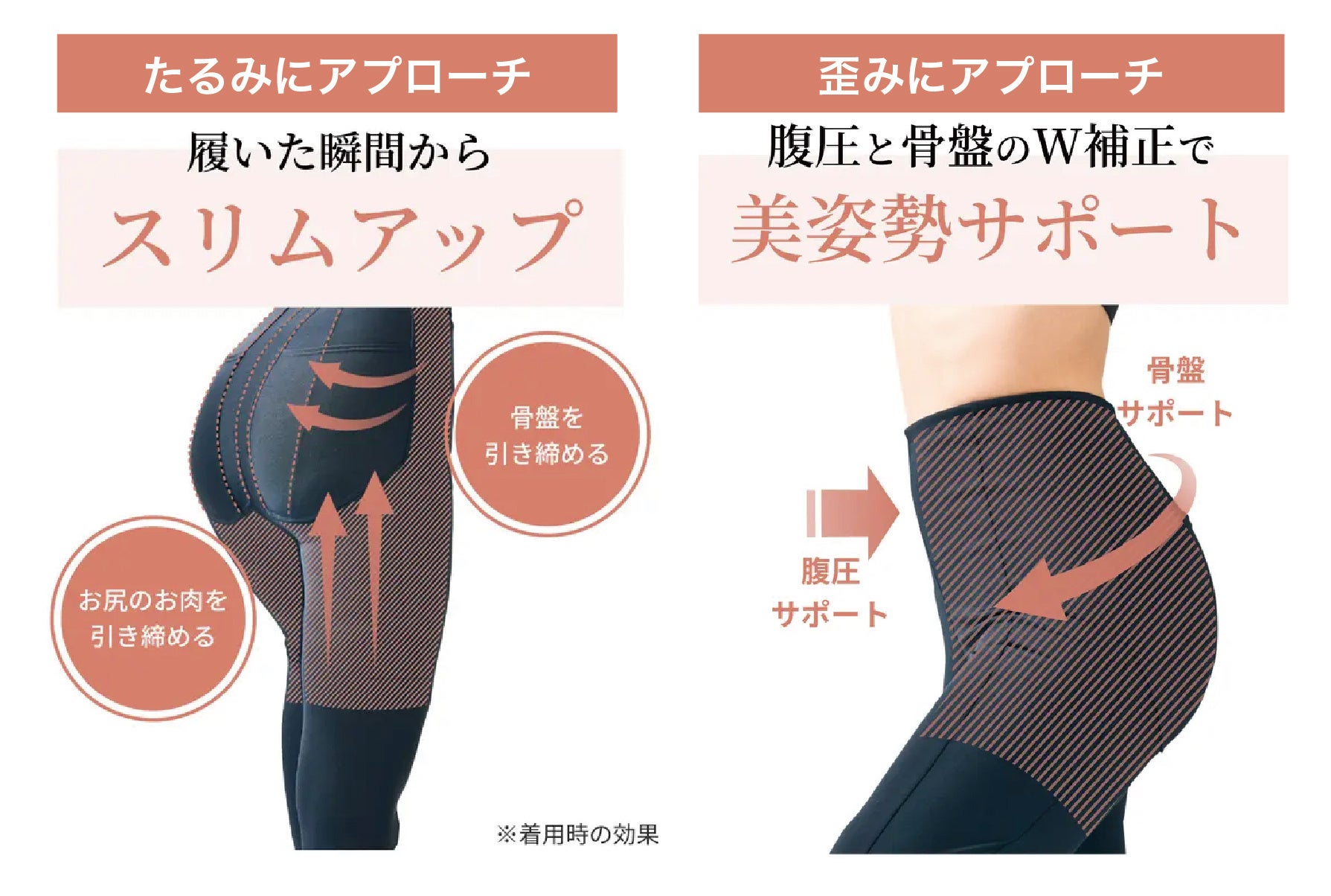 また、ウエスト部のパネルは、腹部前面への腹圧サポートと骨盤周りへのサポー トに効果的。履くだけで腹圧が入るので、自然に美しい姿勢へと身体バランスも 整っていきます。