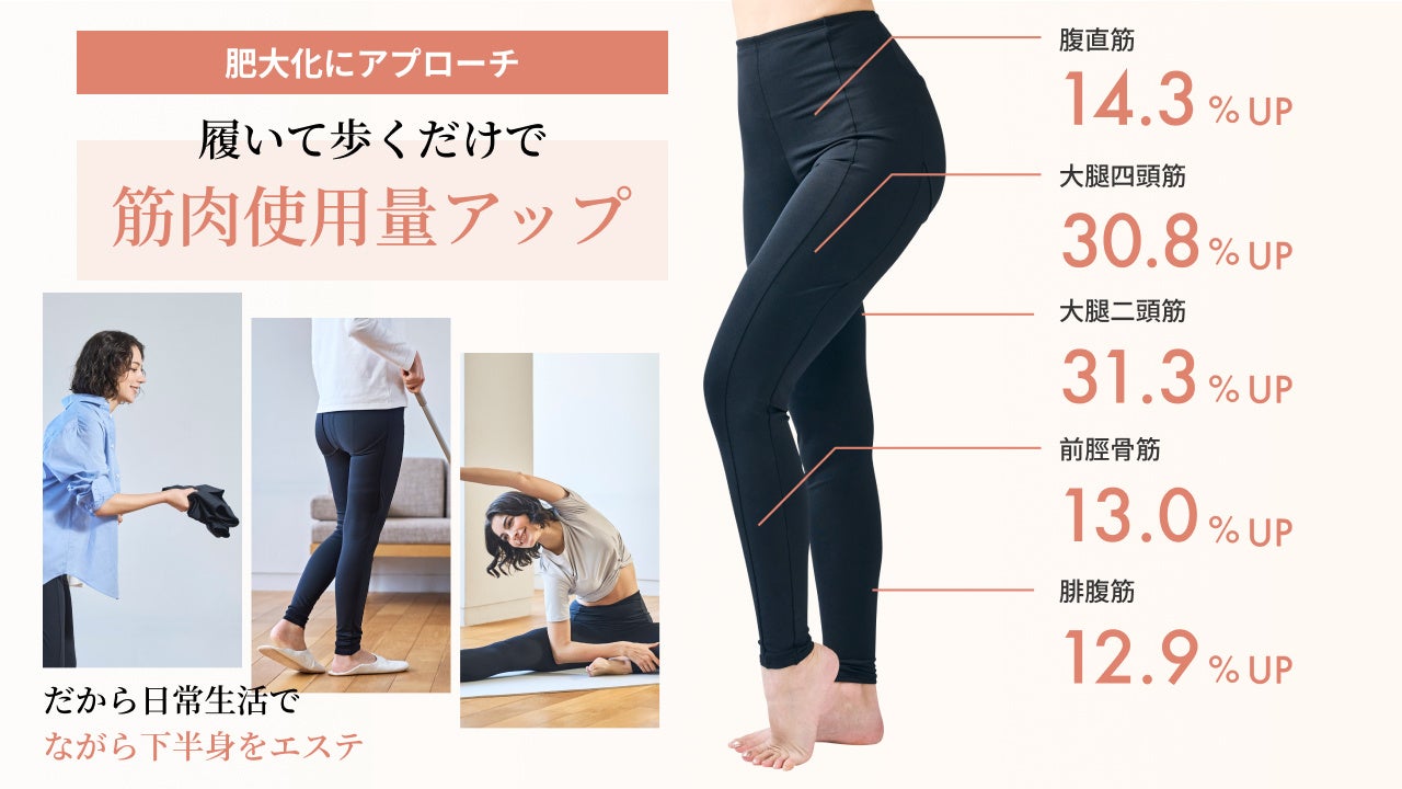 履いて歩くだけで平均約15%の代謝アップが見込まれるので、脂肪などの肥大化 へアプローチ。着用するだけで、日常生活での『ながら下半身エステ』を叶えるのです。