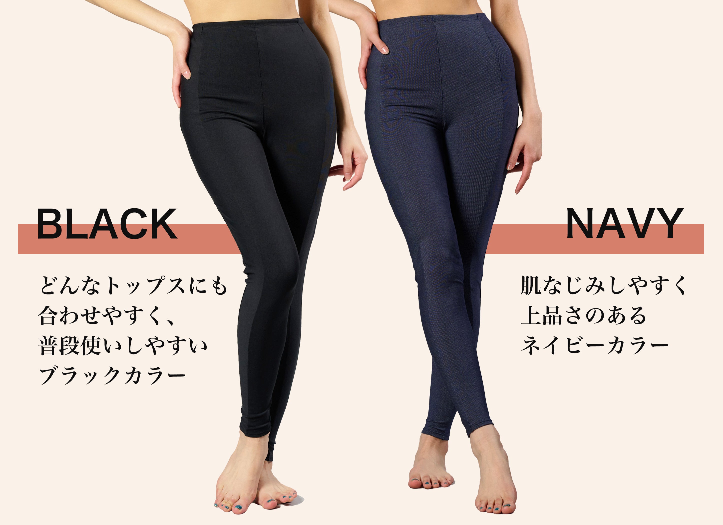 背面ポケットをつけ、スマートフォンなどを入れておくことも可能。カラーも使 いやすく、色々なお洋服に合わせやすいブラック・ネイビーの2色をご用意しました。スキニーパンツのような使い心地と見た目で、日常生活のどのシーンでも 使いやすいデザインをのレギンスパンツを目指した商品になっています。