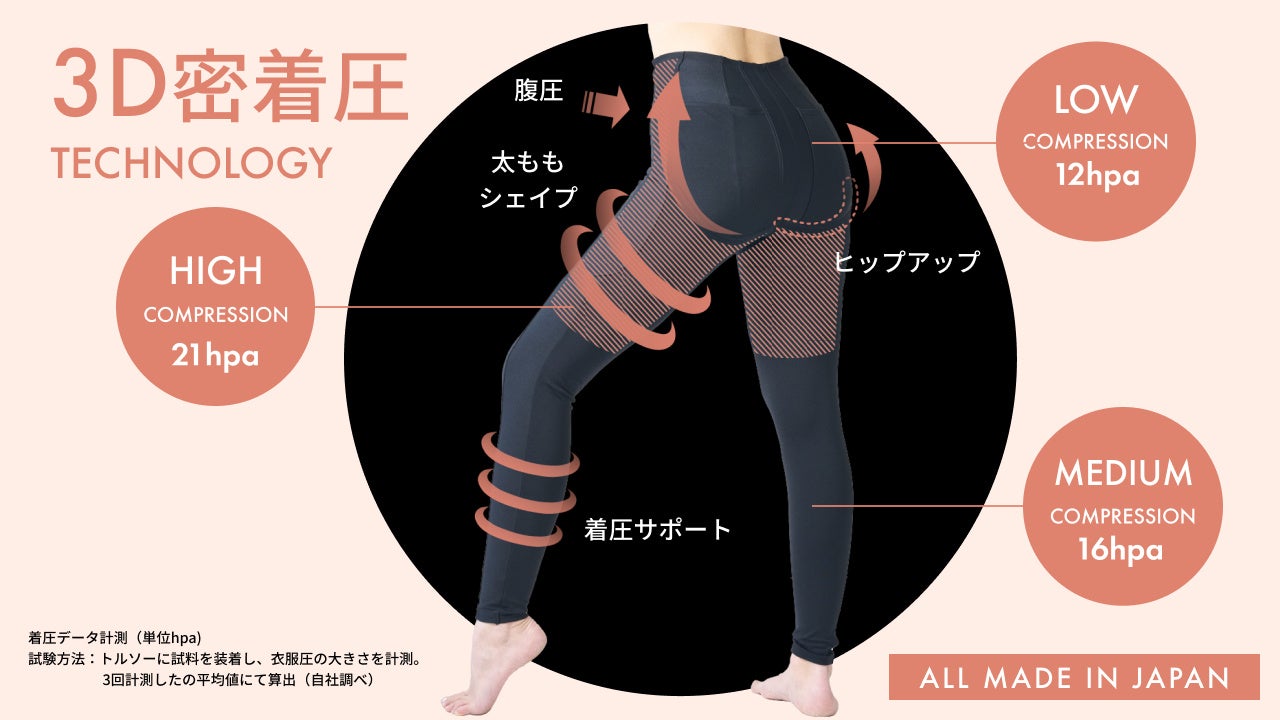 <履くだけで、エステできる新時代>美姿勢サイエンスから生まれた3D密着圧!履くだけエステ効果を実現するレギンス!立体縫製技術40年の技術から生み出されるジャパンメイドの高品質アイテム