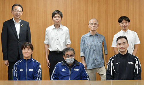 令和6年10月1日(火曜日)、出場者10人のうち6人が市役所を訪問。濱田市長に「日本新記録を出せるよう頑張ります」「メンバー全員と力をあわせて必ずメダルをとります」などと力強い決意を述べました。濱田市長は「悔いのないようベストを尽くして試合をしてください。健闘を祈っています」と選手たちを激励しました。