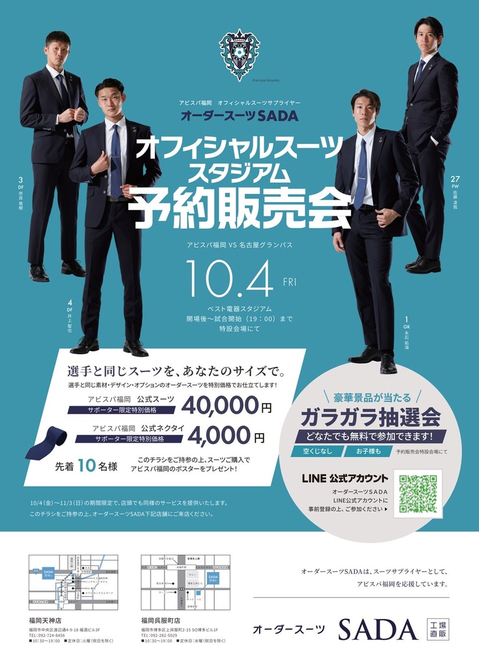 初回19,800円(税込21,780円)~オーダースーツを提供する株式会社オーダースーツSADA(本社:東京都千代田区、代表取締役:佐田展隆)は、2024年10月4日(金)に開催される『オーダースーツSADA オフィシャルスーツスタジアム予約販売会』にて、アビスパ福岡オフィシャルスーツの予約販売会をベスト電器スタジアムで実施いたします。オーダースーツSADAは、オフィシャルスーツサプライヤーとしてアビスパ福岡を応援しています!