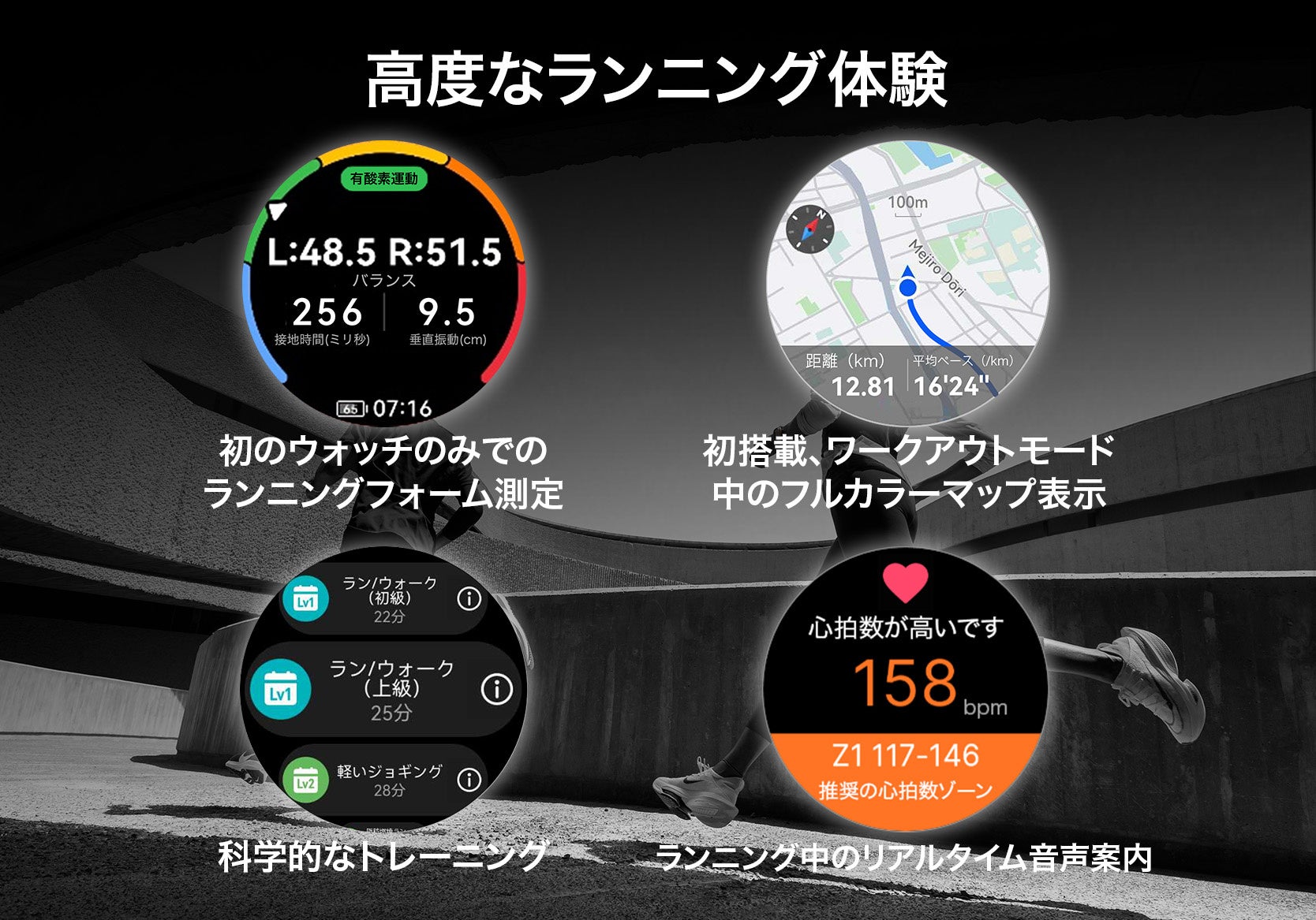 ワークアウト中、ウォッチ画面にフルカラーマップを表示することができるようになりました。自分の位置やルートを、マップ内に印された形で見ることができます。 また、ランニングフォーム分析機能を新搭載。左右の足のバランス、接地時間などの科学的データを提供します。この機能により、あらゆるレベルのランナーがランニングパフォーマンスを向上させ、怪我のリスクを軽減することが可能です。そのほか、ランニング能力指数など様々な項目が測定でき、ランニング中のリアルタイム音声案内などのサポートも万全です。