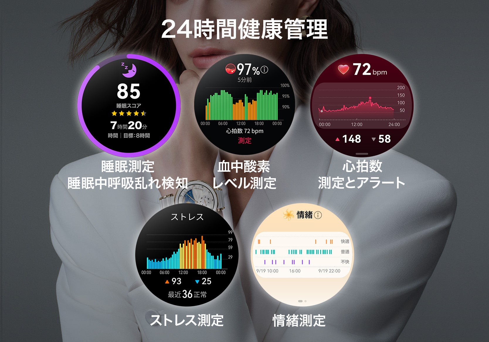 ※4:本製品は日常的な運動・健康管理のための製品であり、医療機器ではありません。本製品のデータは医療行為または精度を要する業務・専門的な計測には使用いただけません。本製品及び関連アプリの「健康管理」にかかわる機能は、健康な個人の健康の増進を目的とするものであり、疾病の診断、予防や治療を目的とするものではありません。健康管理や生活習慣にかかわる表示や助言は健康な方への一般的なものであり、個別の事情や医師の指示、治療計画がある場合にはそれらを優先してください。24時間連続の測定とは一定期間毎の計測値を定期的に表示することを意味しています。