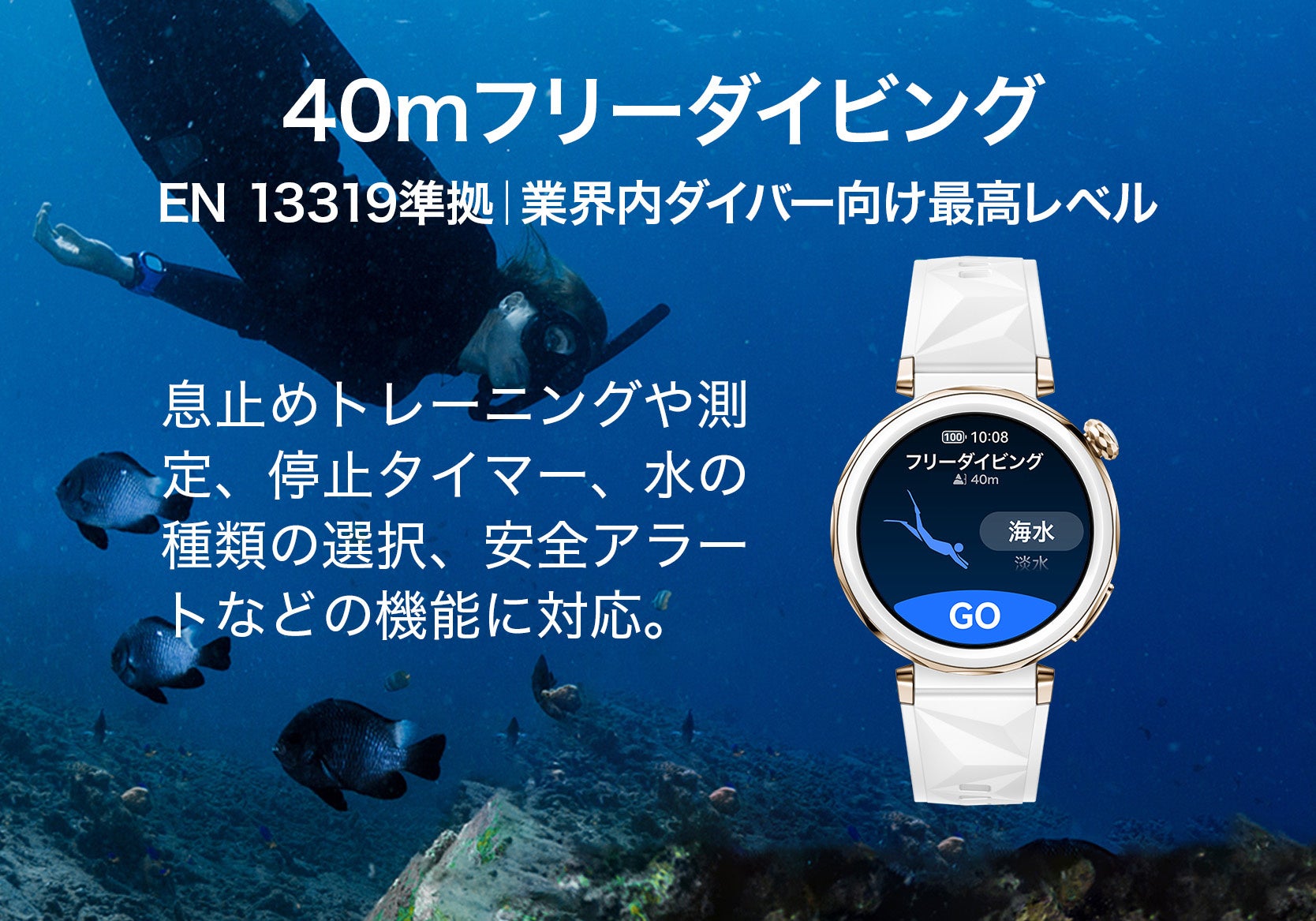 素材や強化された防水機能により、グローバルのダイビングアクセサリーの厳しい基準を満たし、 『HUAWEI WATCH GT 5 Pro』は水深40メートルのフリーダイビングに対応しました※1。水深や時間に関するパーソナライズされたリマインダーやアラームを設定し、安全を守ることもできます。