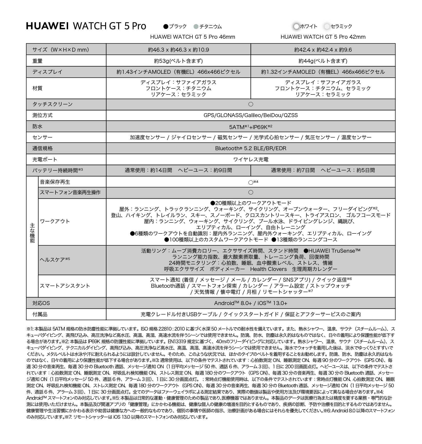 『HUAWEI WATCH GT 5 Pro』の主な仕様