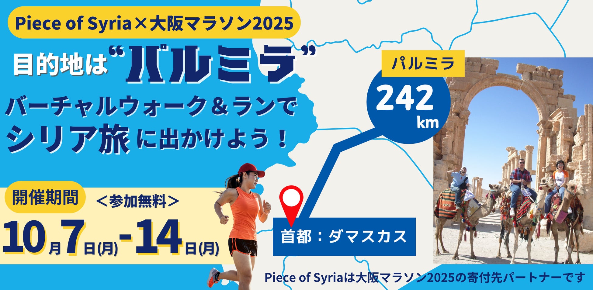 シリアの教育支援を行う団体「Piece of Syria」は、2025年2月に開催される大阪マラソンの寄付先に選ばれ、この度、大阪マラソンのチャリティにちなんだ「バーチャルラン&ウォーク」イベントを開催します。世界中のどこからでも、走ったり歩いたりして、期間中の走行距離の合計で首都ダマスカスからシリアの古代都市「パルミラ」までの距離を242キロ達成を目指します。
