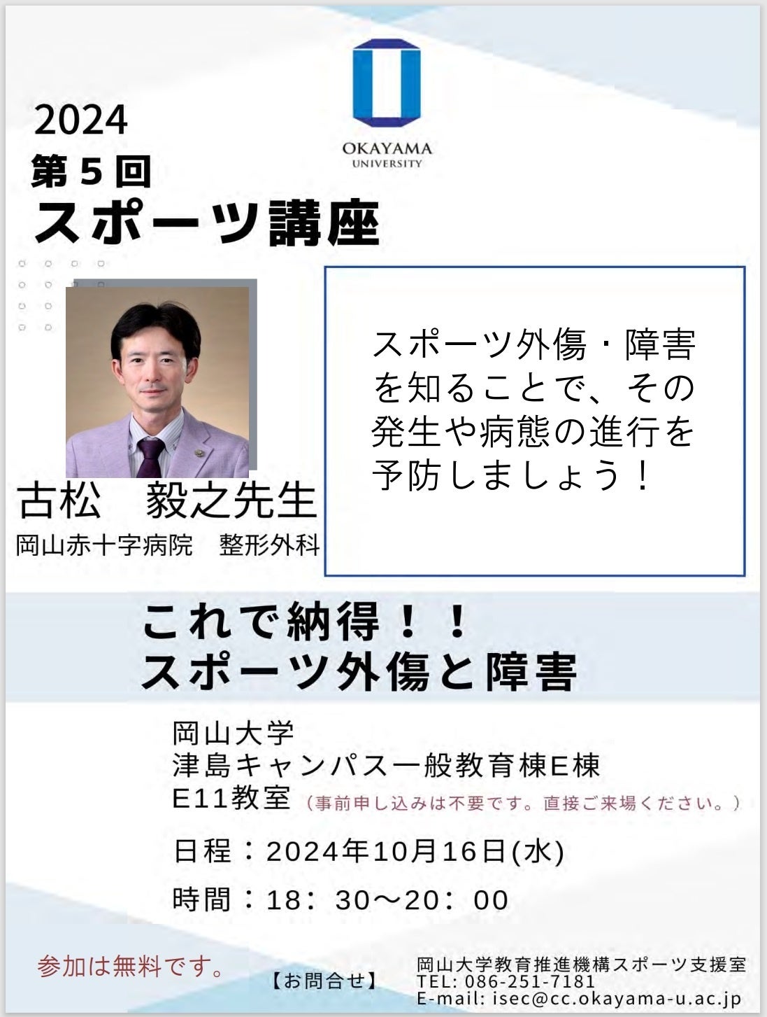 国立大学法人岡山大学(本部:岡山市北区、学長:那須保友)の教育推進機構スポーツ支援室では、スポーツ講座を開催しています。