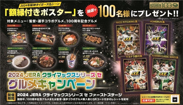 キャンペーン開催期間中、「阪神甲子園球場100周年記念グルメ」または「監督・選手コラボグルメ」を購入された方の中から抽選で100名様に、「額縁付き2024阪神タイガース名シーンポスター」を1つプレゼントします。