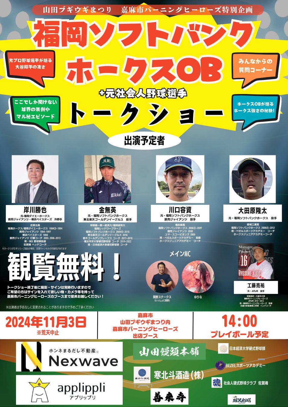 またネクスウェイブは本イベントで開催される、山田ブギウギまつり 嘉麻市バーニングヒーローズ特別企画「福岡ソフトバンクホークスOB +元社会人野球選手 トークショー」にも協賛をしております。