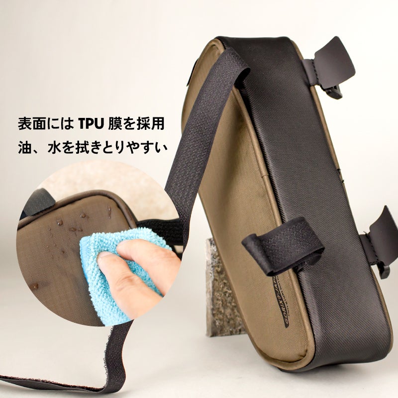 トップチューブバッグ表面にはTPU膜を採用して、油、水を拭きとりやすいです。