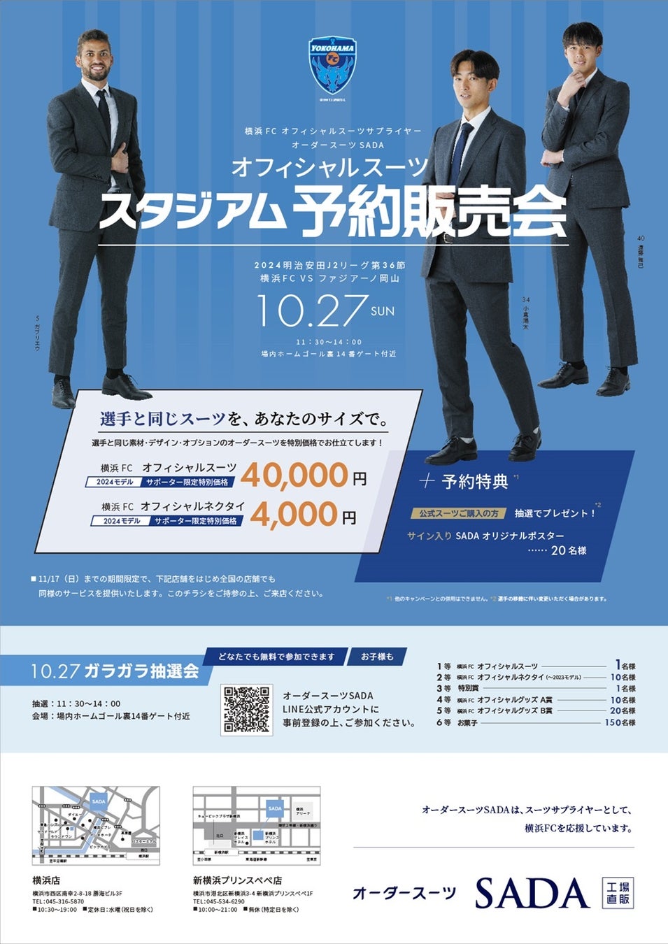 初回19,800円(税込21,780円)~オーダースーツを提供する株式会社オーダースーツSADA(本社:東京都千代田区、代表取締役:佐田展隆)は、2024年10月27日(日)に開催される『オーダースーツSADA オフィシャルスーツスタジアム予約販売会』にて、横浜FCオフィシャルスーツの予約販売会をニッパツ三ツ沢球技場で実施いたします。オーダースーツSADAは、オフィシャルスーツサプライヤーとして横浜FCを応援しています!