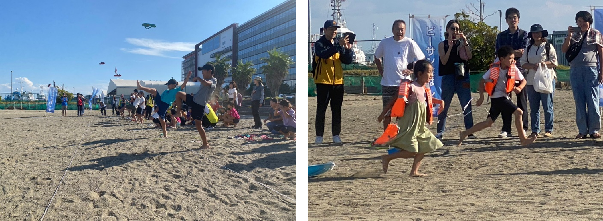 海といえばビーチサンダル。ビーサン跳ばしでは、年代ごとに跳ばせる距離を競いました。麻袋リレーでは、麻袋に入って元気いっぱい浜辺を飛び回りました。レスキューレースでは、ライフジャケットの着脱やソリやペットボトルを使った救助体験など、安全啓発を意識した競技展開で、レースを楽しみながら学ぶことができました。