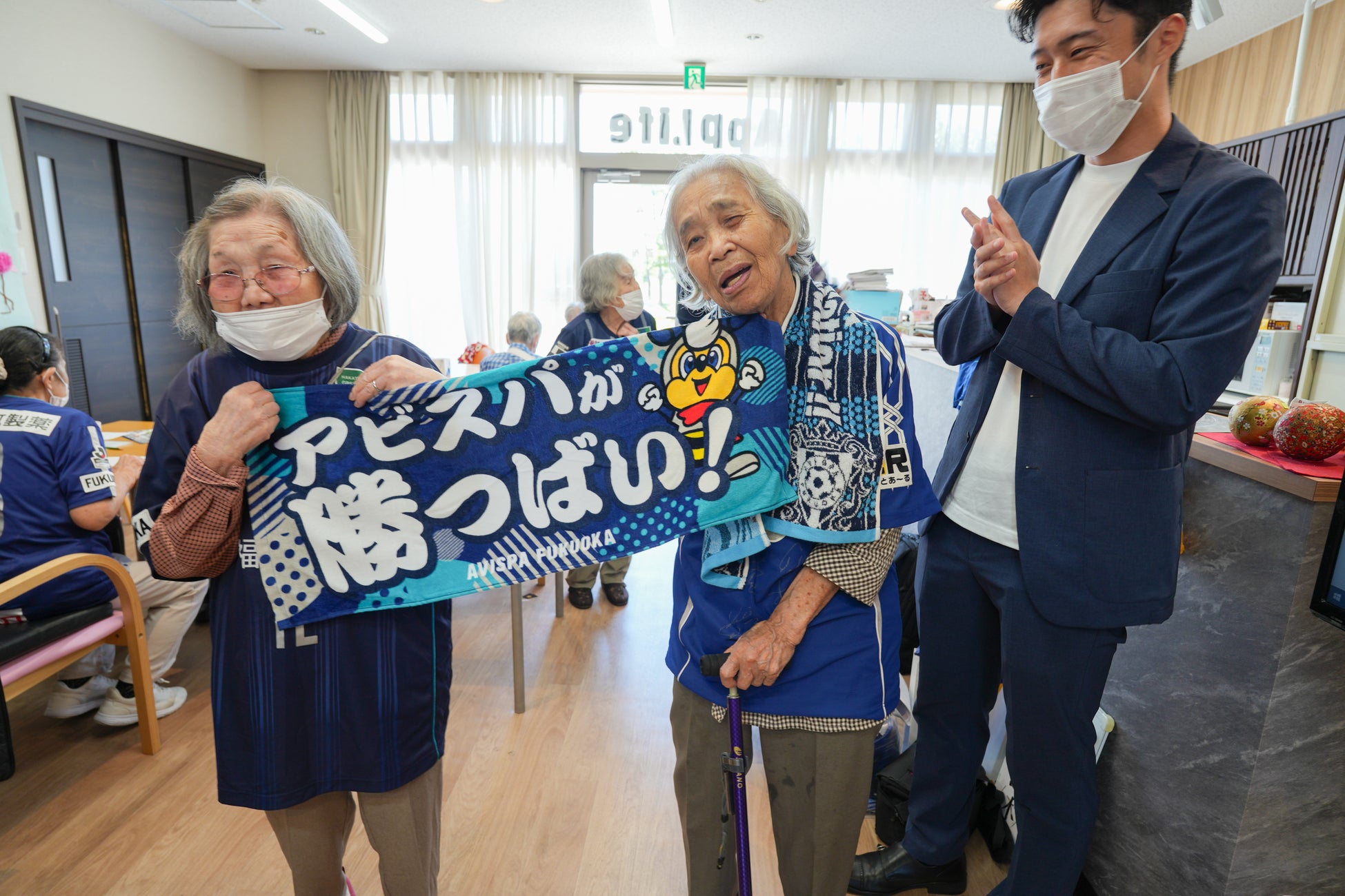 プロジェクトの第1弾では「ユニの輪チャレンジ」と題し、アビスパ福岡のファン・サポーターの皆さまから回収した古着のユニフォーム・タオルマフラーを、フリースクールや高齢者施設に寄贈し、アビスパ福岡の応援の輪を広げる活動をおこないました。