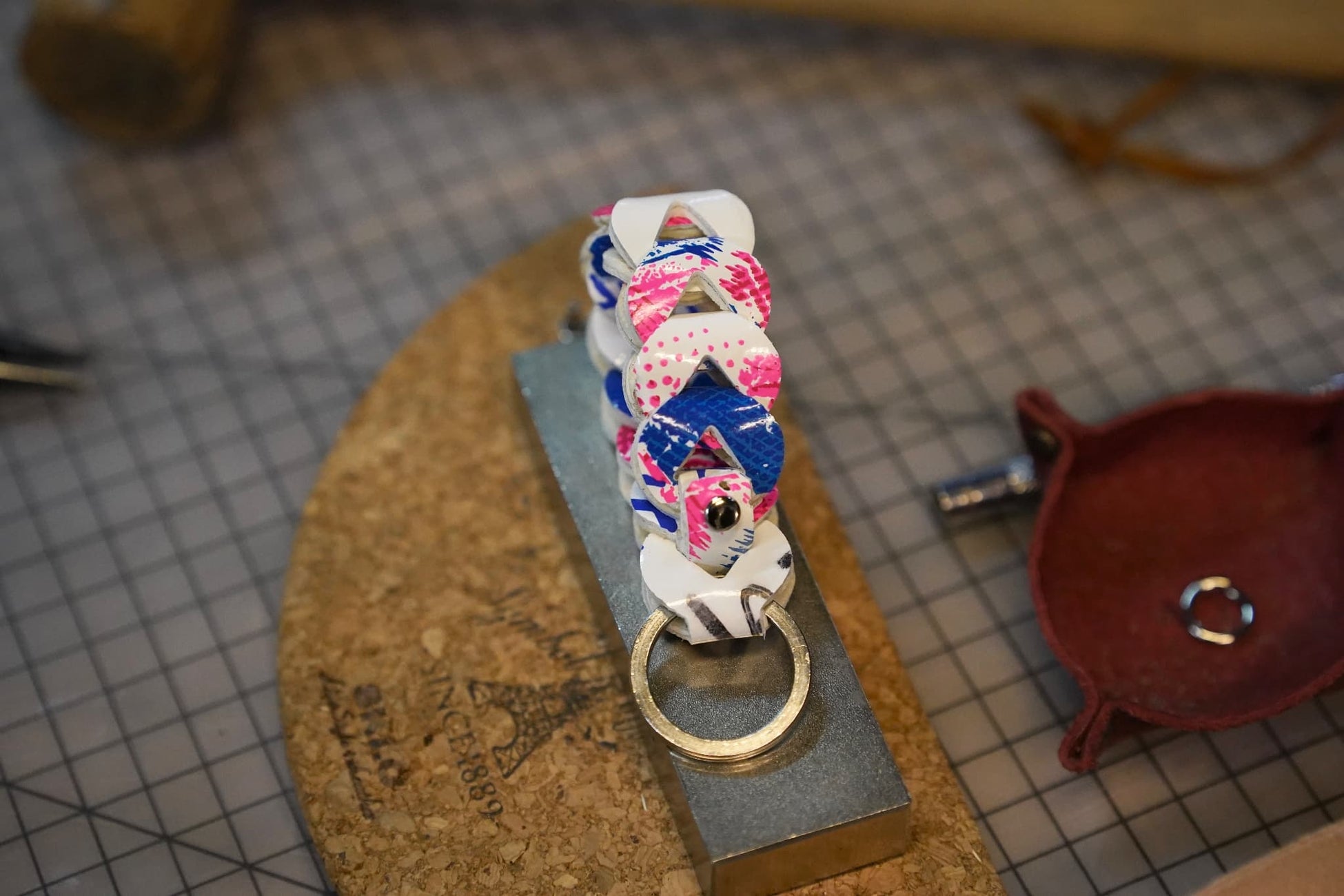 当ワークショップでは、アビスパ福岡のファン・サポーターの皆さまから寄付していただいた思い出のサッカーボールを使って、廃棄ボールから作るキーホルダー「キーボルダー」を制作することができます。