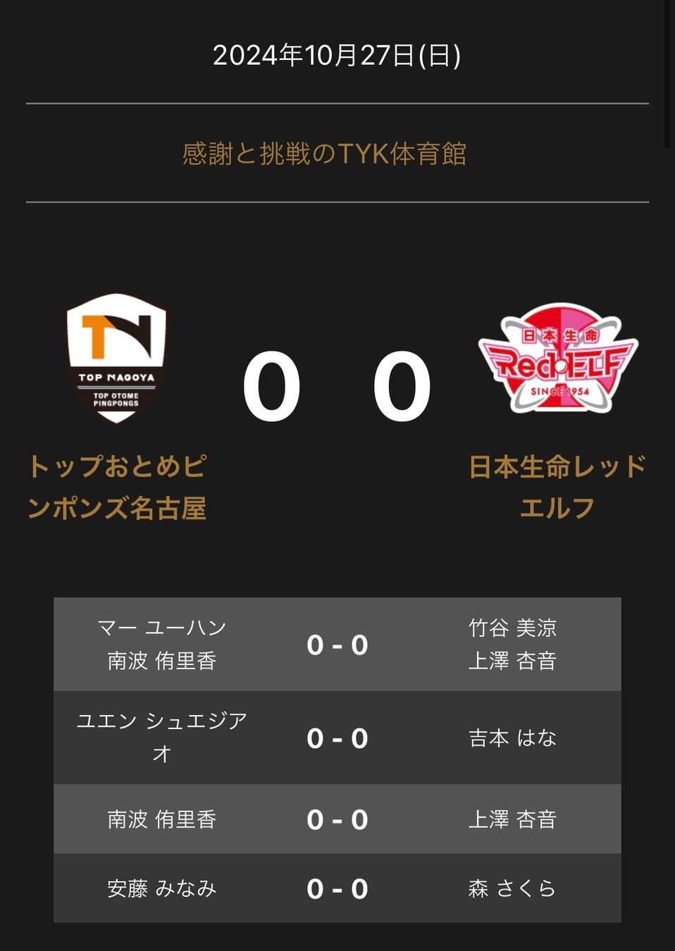 ノジマTリーグ 2024-2025シーズン 公式戦 10月27日開催 トップおとめピンポンズ名古屋vs 日本生命レッドエルフ オーダーを発表いたします。