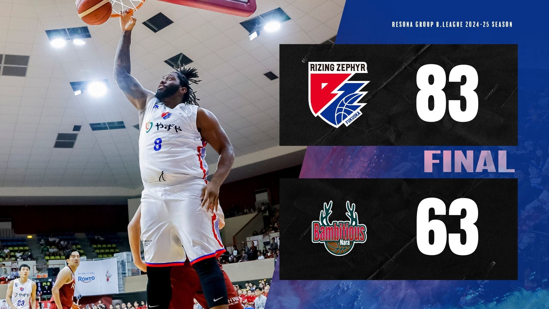 2024年10月27日(日)に開催された、りそなグループBリーグ 2024-25シーズン【バンビシャス奈良vs.ライジングゼファーフクオカ】において“奈良63-83福岡”の結果となりましたことお知らせいたします。