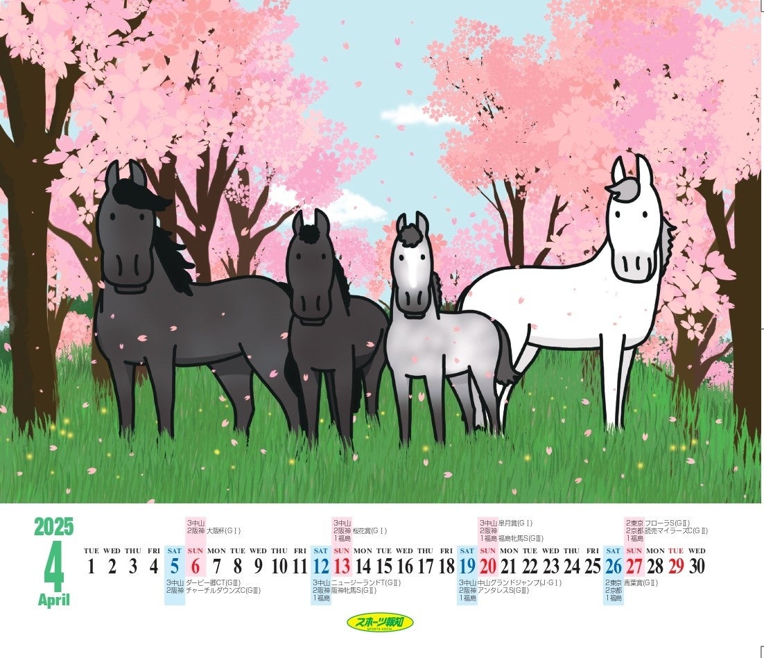 「スポーツ報知」を発行する報知新聞社(代表取締役社長・依田裕彦)は、全国の競馬ファンを魅了する馬のイラストレーター・おがわじゅりさんが描いた、実在馬と架空馬を組み合わせたイラストカレンダーを11月26日(火)から販売します。色彩も鮮やかで、季節にマッチした可愛らしい表情や、躍動感あふれる競走馬や架空馬が卓上判に収まっています。さらに2025年のJRA開催日程(レーシングカレンダー)がイラスト面、カレンダー面の両方に掲載されている実用性抜群なカレンダーとなっています。
