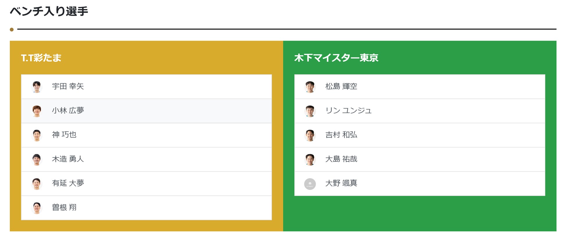 ノジマTリーグ 2024-2025シーズン 公式戦 11月17日開催 T.T彩たま vs 木下マイスター東京のベンチ入り選手を発表いたします。
