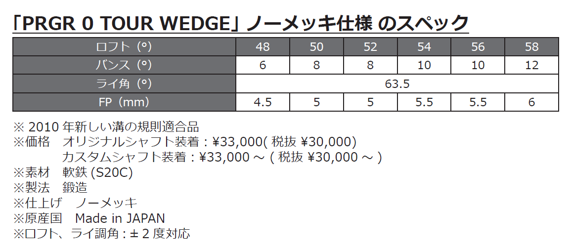 「PRGR 0 TOUR WEDGE」は2023年3月に発売した安定したスピンと操作性を両立したツアーウェッジで、ノーメッキ仕上げにすることにより打感にこだわりを持つアスリートゴルファーを満足させるソフトなフィーリングを実現しています。また、フェース⾯には「縦マイクロミーリング処理」を施し、⾬やラフといったイレギュラーな場⾯でもスピンの安定化を図っています。さらに、ロフト角に合わせてソール形状を緻密に変化させることで、ツアープロの要求にも応える高い操作性を実現しました。