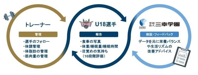 (※図参照:キングスU18選手・トレーナー・三幸学園が連携してコンディショニングを最適化)