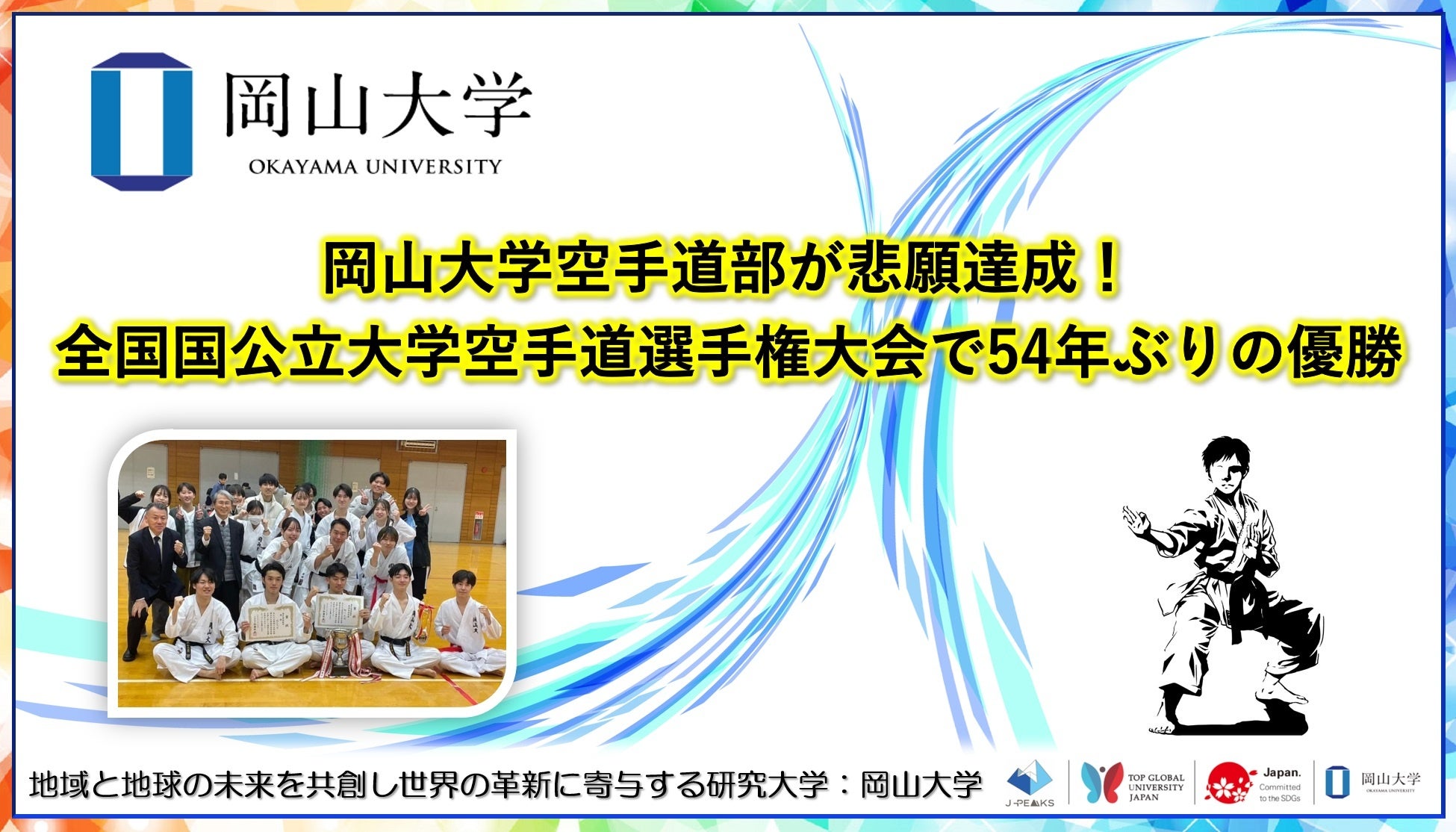 国立大学法人岡山大学(本部:岡山市北区、学長:那須保友)は、2024年11月24日に大阪大学吹田キャンパスにて開催された「第45回全国国公立大学空手道選手権大会」に本学空手道部が出場し、男子団体組手で優勝に輝きました!本大会での優勝は54年ぶり、4度目のことであり、上位入賞は38年ぶりのことです。昨年のベスト8という結果からさらに躍進しました。