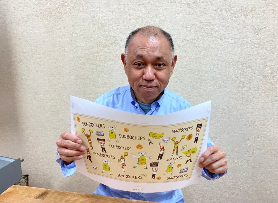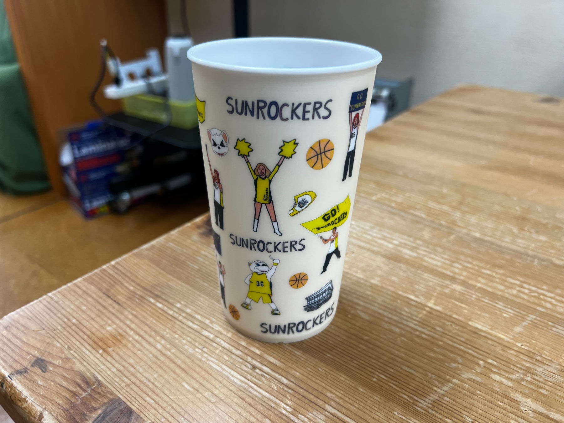 納品されたデータはサンロッカーズ側でレイアウトし、ポップコーンカップのデザインに仕上げました。出来上がったデザインを澤田さんは嬉しそうに眺めていました。