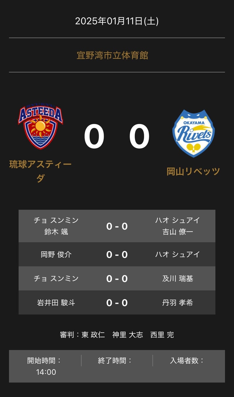ノジマTリーグ 2024-2025シーズン 公式戦 1月11日開催 「琉球アスティーダ vs 岡山リベッツ」の対戦オーダーを発表いたします。