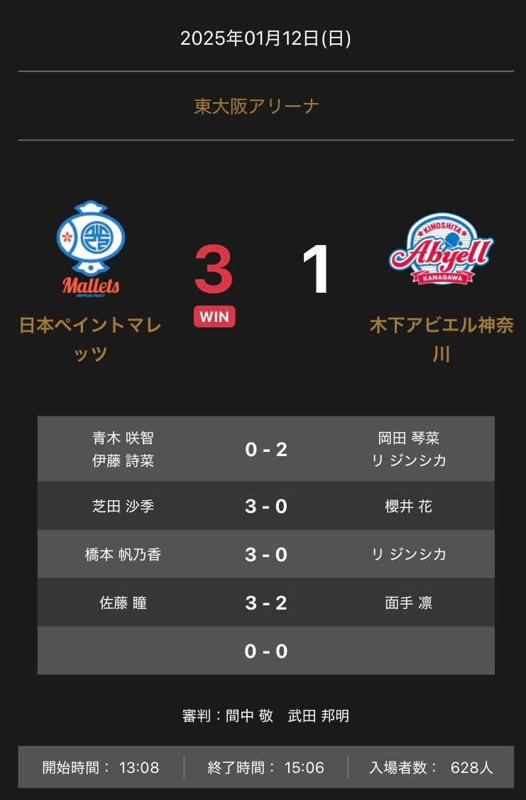 日本ペイントマレッツと木下アビエル神奈川の試合は、3-1で木下アビエル神奈川が勝利しました。